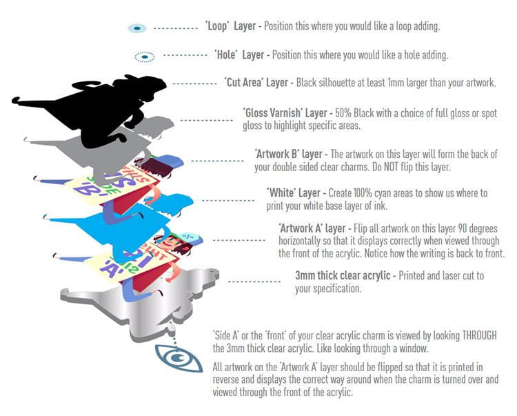 Here's an exploded view of our clear acrylic charms, showing how each layer sits together to make your custom charm designs. You can view the full visual set up guide here.